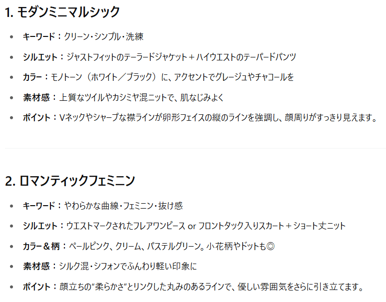 「私の顔に似合うファッションスタイルは?」と尋ねれば、顔の印象に合ったファッションテイストやカラーパレットを提案してくれます。ショッピングの参考になりますね。