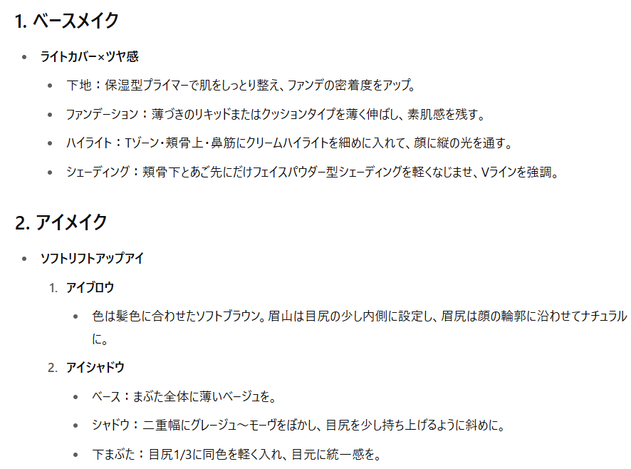 顔の特徴を分析した上で、おすすめのメイク方法も教えてくれます。「目を大きく見せるメイク」「小顔に見せるハイライトの入れ方」など、具体的なテクニックまで紹介してもらえます。