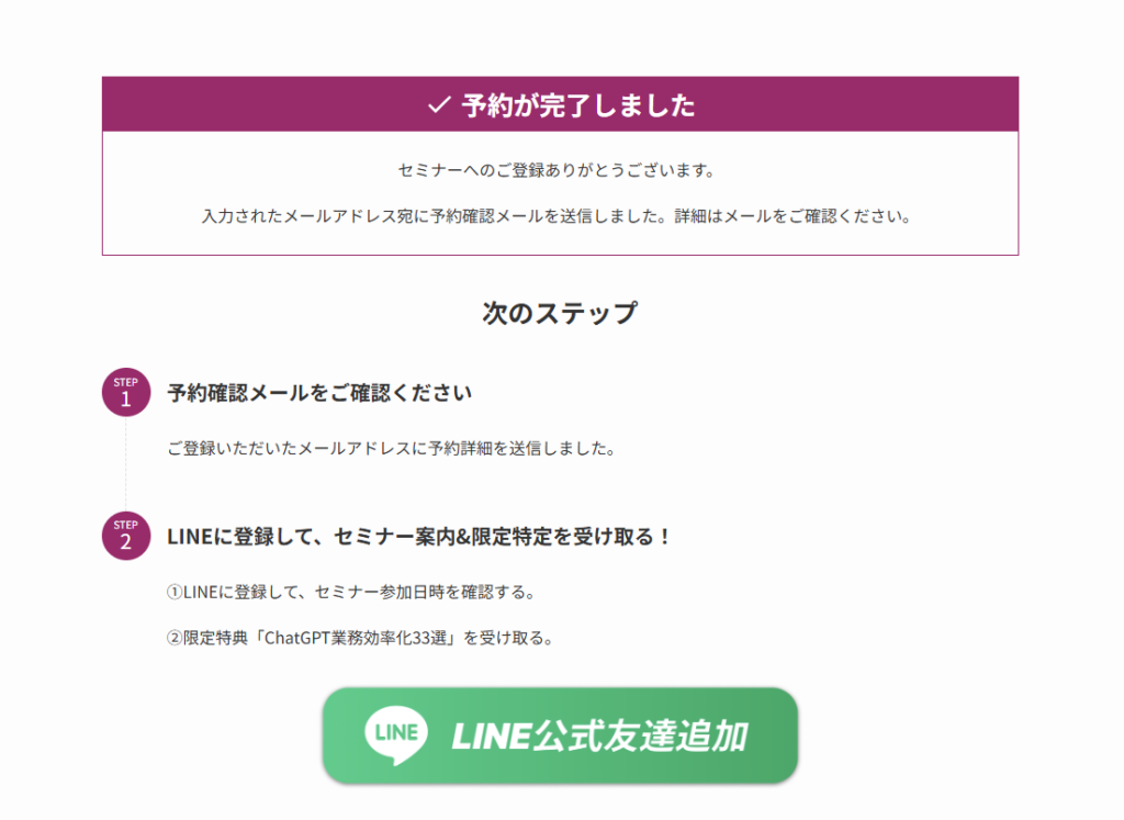 セミナーの申し込みを終えると、以下の画面に切り替わり、その後LINEのQRコードが案内されました。