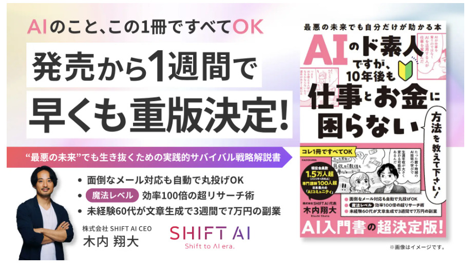 また、同年6月には、木内氏の著書「AIのド素人ですが、10年後も仕事とお金に困らない方法を教えて下さい! 最悪の未来でも自分だけが助かる本」が発売され、発売後わずか1週間で5,000部の増刷が決定しました。
