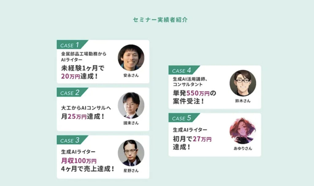 さらに副業で収入を得たり、昇進・転職などに役立つ生成AI活用スキルを学びたい方は完全無料の生成AIセミナーに参加するのがおすすめです。