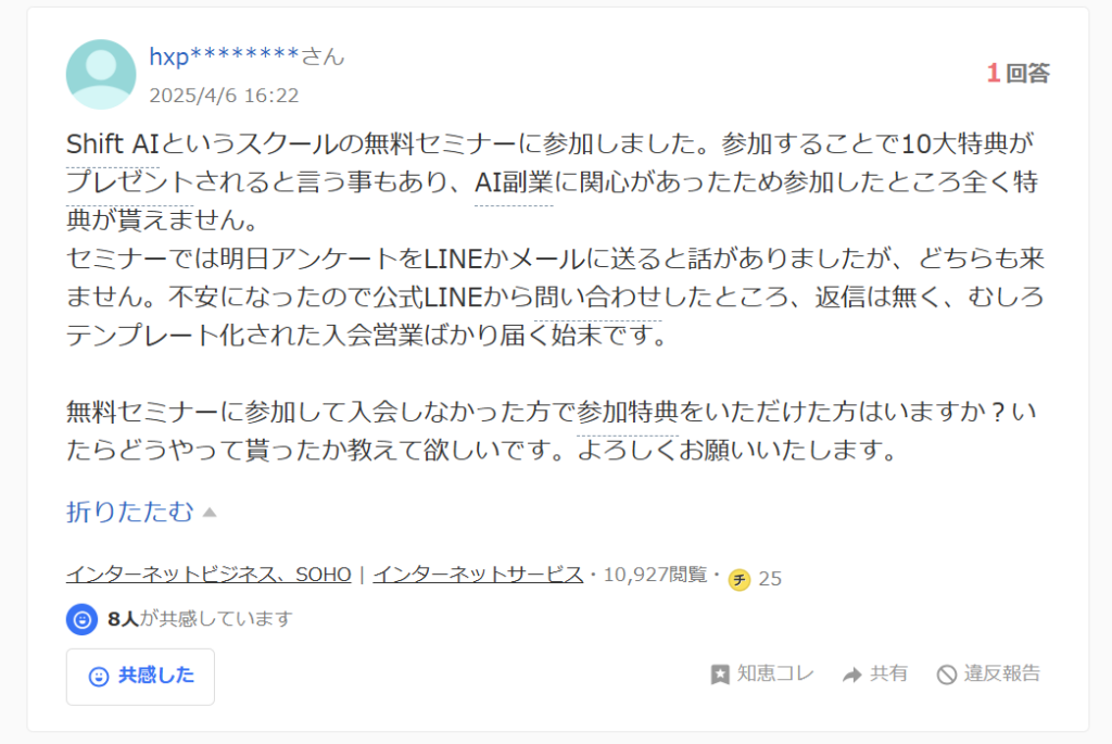 このような広告から受けるイメージと実際のサービスの内容からも、「SHIFT AIに騙された」「SHIFT AIは詐欺だ」という声が生まれています。