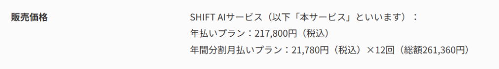 SHIFT AIの料金は分割払いの場合、「月額21,780円」と案内されていますが、これは1年分(261,360円)を12回に分けて支払う形式です。そのため、一般的な「必要なくなったらすぐ解約できる」月額サブスクリプションとは仕組みが異なります。