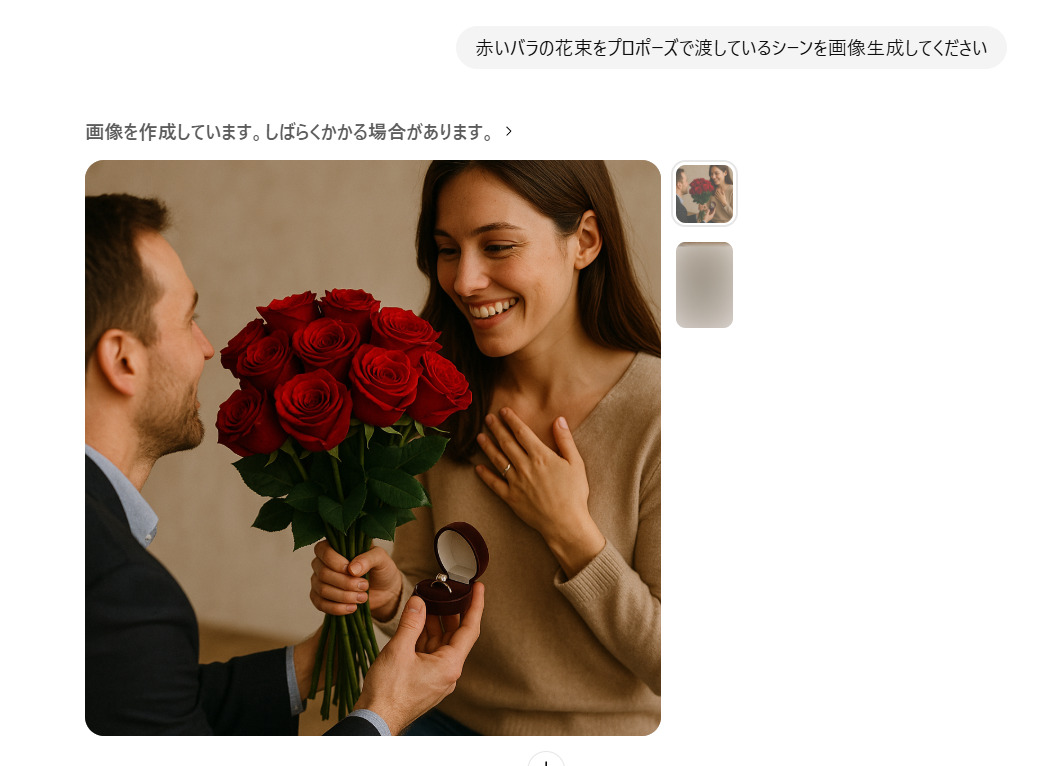 〇「赤いバラの花束をプロポーズで渡しているシーンを画像生成してください」