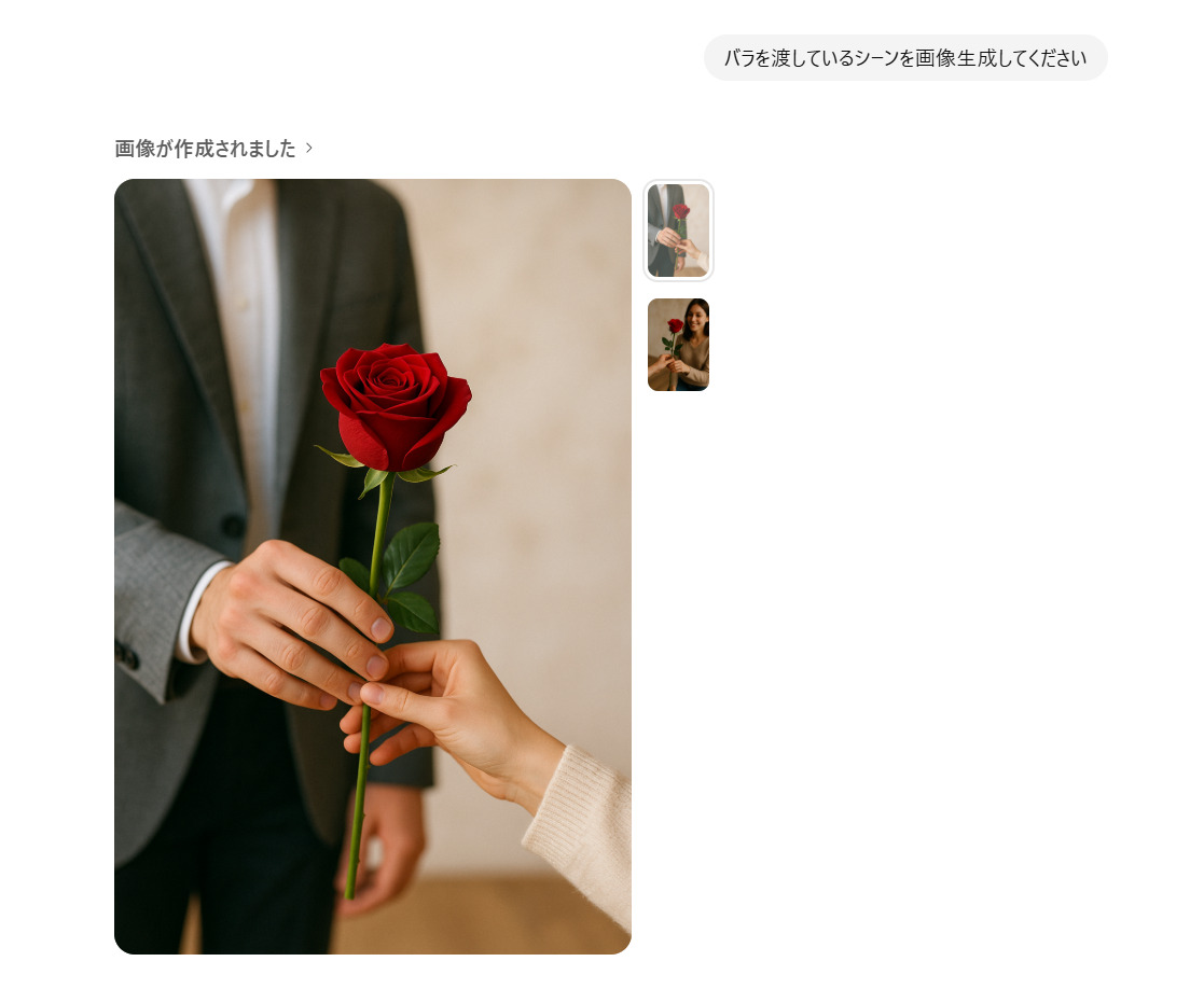 「赤いバラの花束をプロポーズで渡しているシーン」の画像を生成したい場合を例に、2つのプロンプトを比較して説明します。