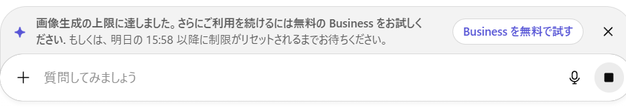 画像生成を始めたのが15:58だったので、制限が解除されるのはちょうど24時間後です。