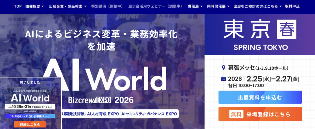 | AI World | 対面(幕張メッセ) | 2026/2/25〜27 | なし | ビジネス関係者 | 最新AI技術・業務活用 |