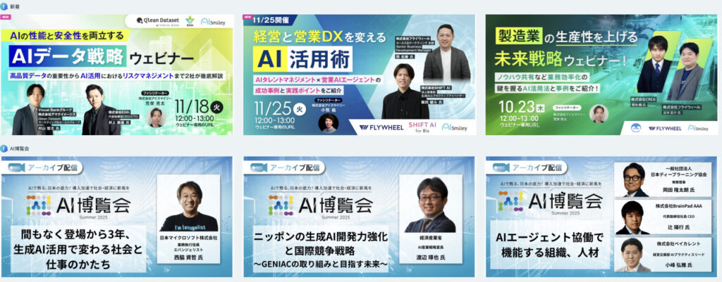 | AIsmiley「生成AIウェビナー」 | オンライン | 多数開催 | なし | 中級者 | 最新トレンド・活用事例 |