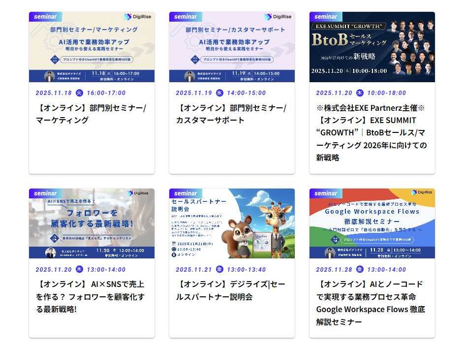 | DigiRise「生成AIセミナー」 | オンライン(アーカイブ) | 随時 | なし | 中級者 | トレンド・基礎活用 |