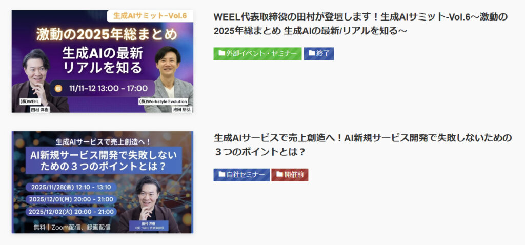 | WEEL「生成AIセミナー」 | オンライン | 定期的 | なし | 中級者 | 企業活用ノウハウ |