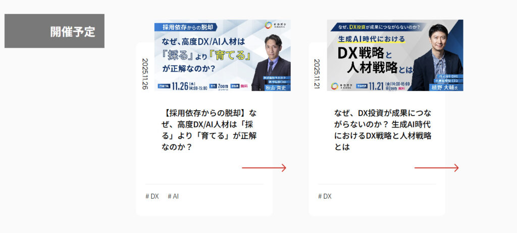 | キカガク「DX/生成AI活用ウェビナー」 | オンライン | 不定期開催 | なし | 企業DX担当者・中級〜上級者 | DX推進・人材育成・生成AI導入設計・業務定着ノウハウ |