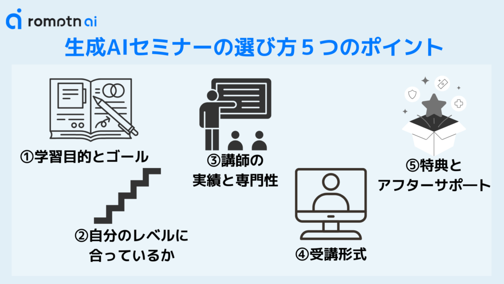 「生成AIセミナーと言っても、多すぎてどれを選べばいいか分からない…」そんな方に向けて、失敗しないセミナー選びのコツを5つにまとめました。