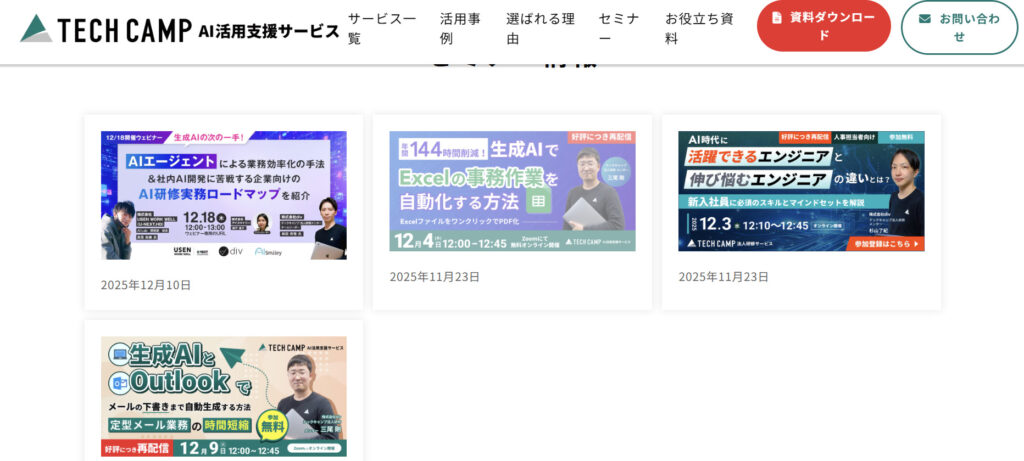 | TECH CAMP(テックキャンプ)無料セミナー | オンライン | 不定期開催 | なし | 企業担当者・エンジニア志向 | AIエージェントによる業務効率化/生成AIによるExcel自動化 | ★★☆☆ | ★★★☆☆ | ★★★★★ |