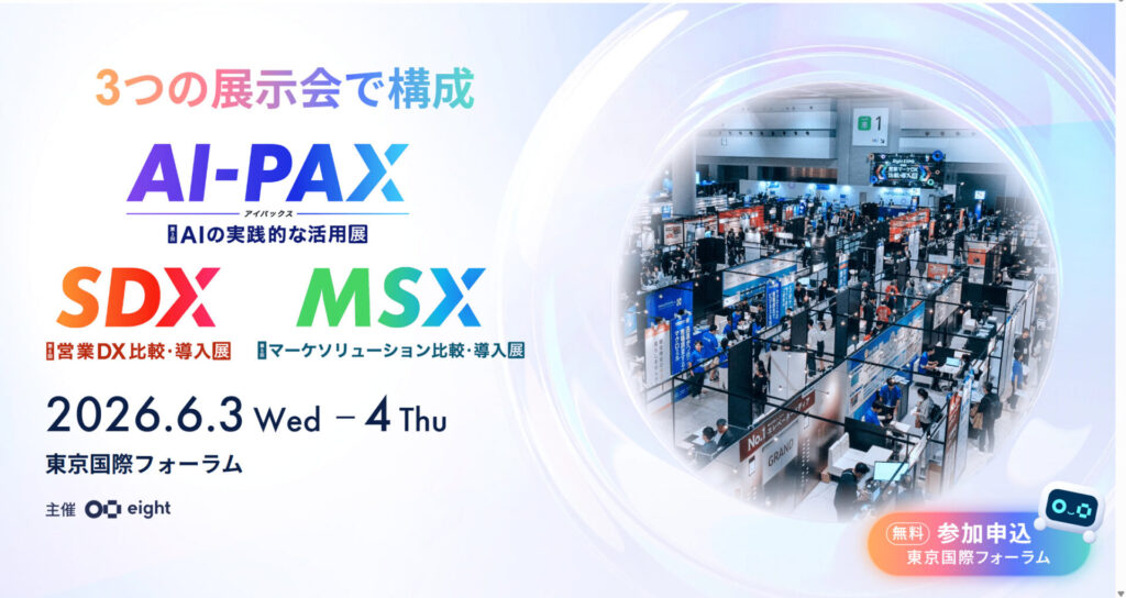 | Eight EXPO 2026夏 | 対面 | 2026/6/3~6/4 | なし | ビジネス関係者・一般 | AIサービス展示・講演・デモ | ★☆☆☆ | ★★☆☆ | ★★★☆☆ |