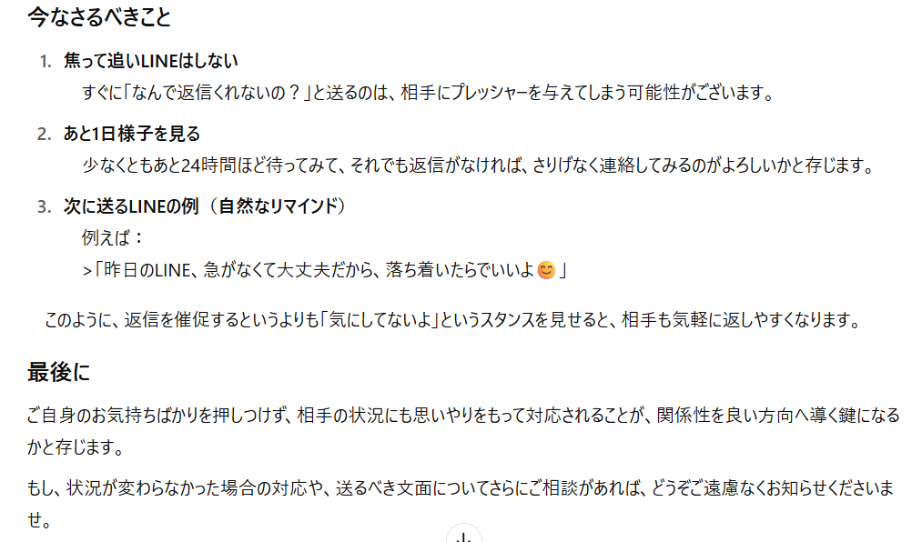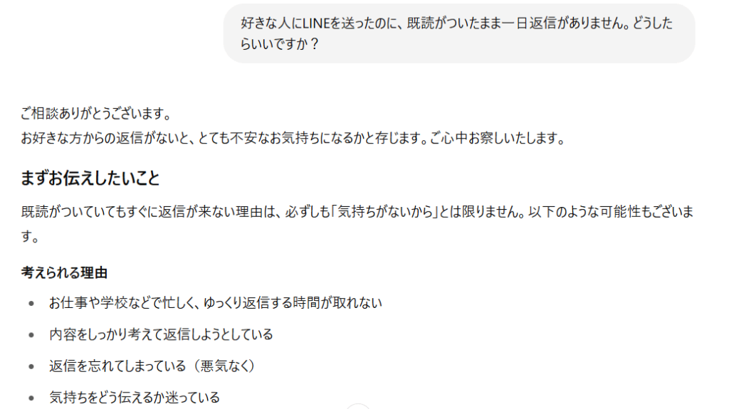 相談内容:「好きな人にLINEを送ったのに、既読がついたまま一日返信がありません。どうしたらいいですか?」