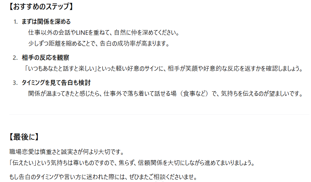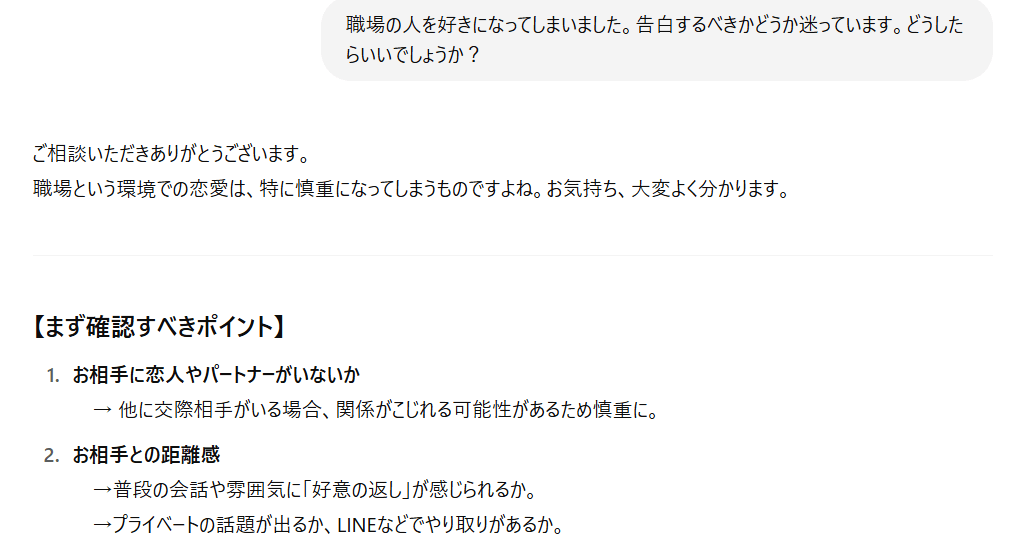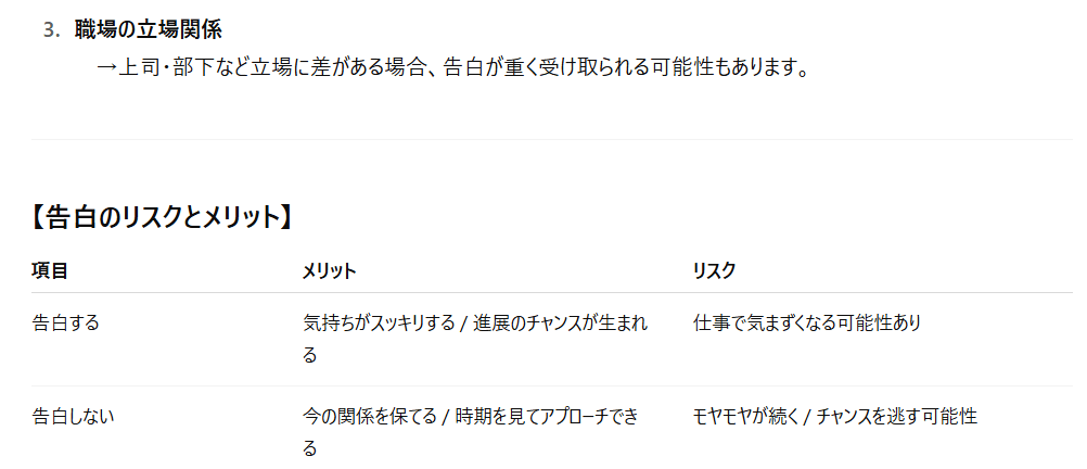 このように、単に「告白しなよ」といった単純なアドバイスではなく、状況に応じたリスクや対処法まで考慮した回答が得られるのがChatGPTの強みです!
