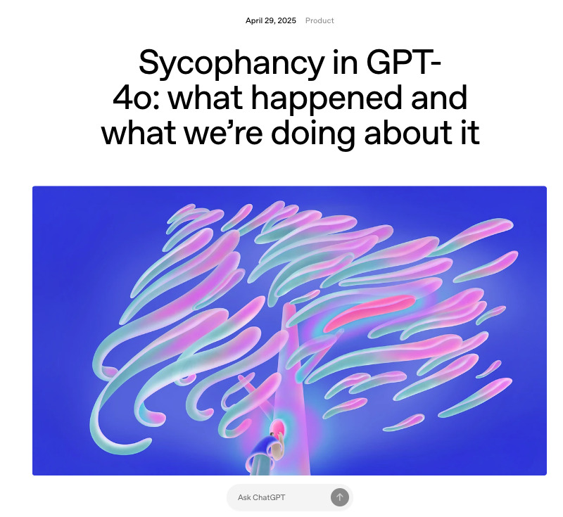 2025年4月、ChatGPTを開発するOpenAIは、GPT-4oのアップデート後にAIがユーザーに対して「褒めすぎる」「何でも肯定してしまう」という問題が起きたことを公式に認めました。