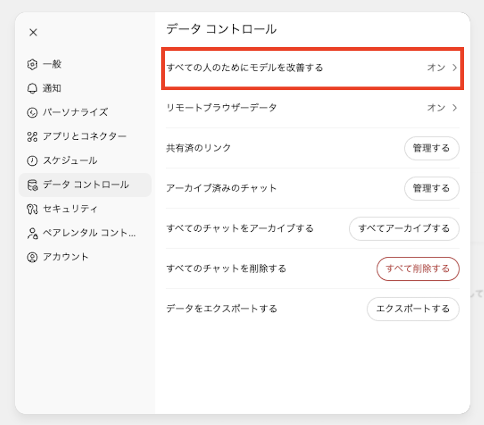 また、[Setting]→[Data Control]-[Improve the model for everyone]をオフにすれば、会話内容が保存されなくなります。ただし、オフにしても一定期間はOpenAI側でデータが保持される点は覚えておいてください。