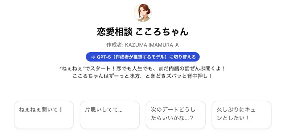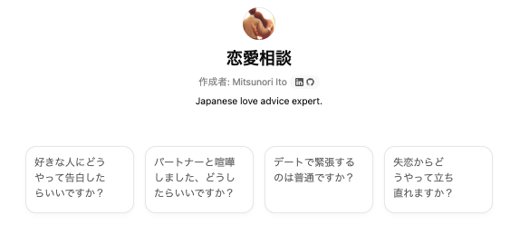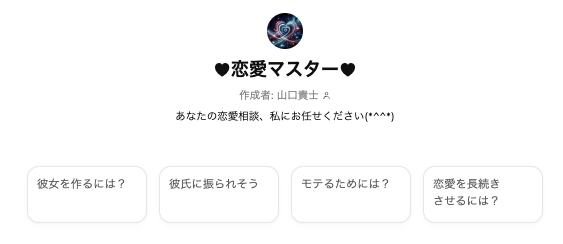 シンプルな名前のとおり、恋愛の悩み全般に対応するGPTsです。人格設定は控えめで、通常のChatGPTに近い落ち着いた文体で回答してくれます。1度の質問で的確かつ詳しい内容が返ってくるので、余計なやり取りなしにアドバイスを得たい人に向いています。