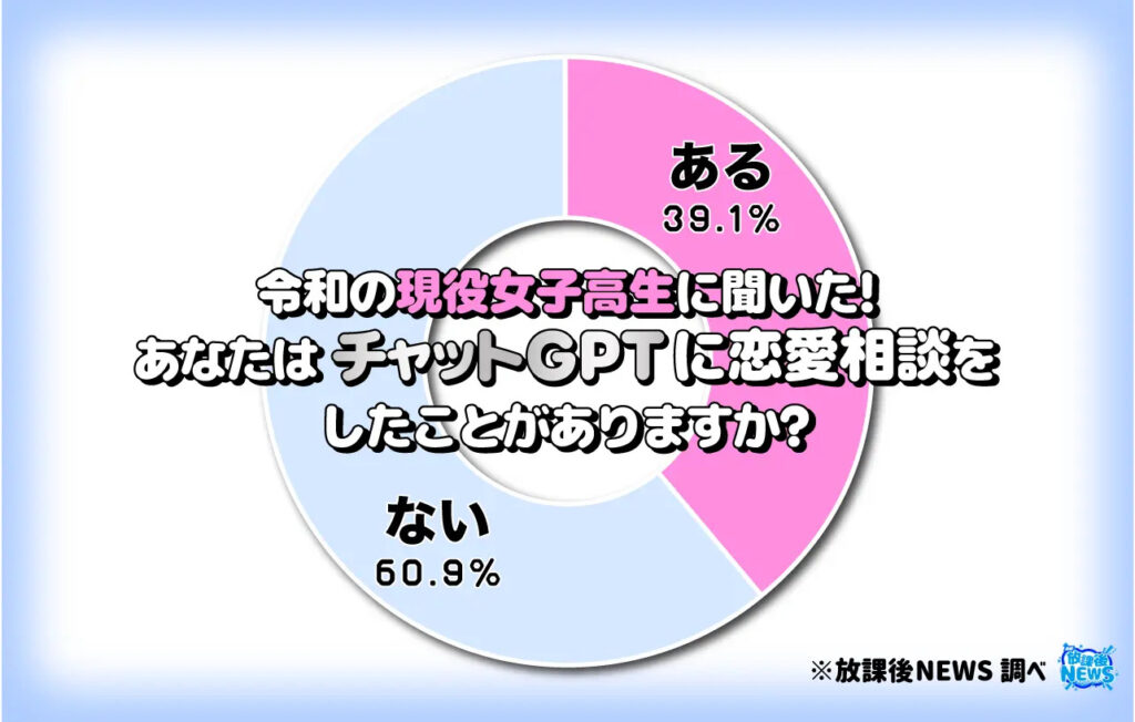 放課後NEWSが現役女子高生を対象に行った調査によると、「ChatGPTに恋愛相談をしたことがある」と回答した人は39.1%にのぼりました。約4割の女子高生がAIに恋愛の悩みを打ち明けた経験があるというのは、驚きの数字ではないでしょうか。
