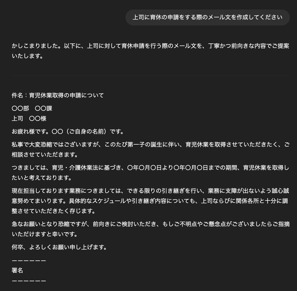 ビジネスメールやお問い合わせへの返信、お礼状などさまざまなシーンでのメール文作成ができます。作成したいメールの目的や相手、伝えたい内容に希望するトーン(丁寧、カジュアルなど)を指示することで、適切なメール文案を数秒で生成してくれます。