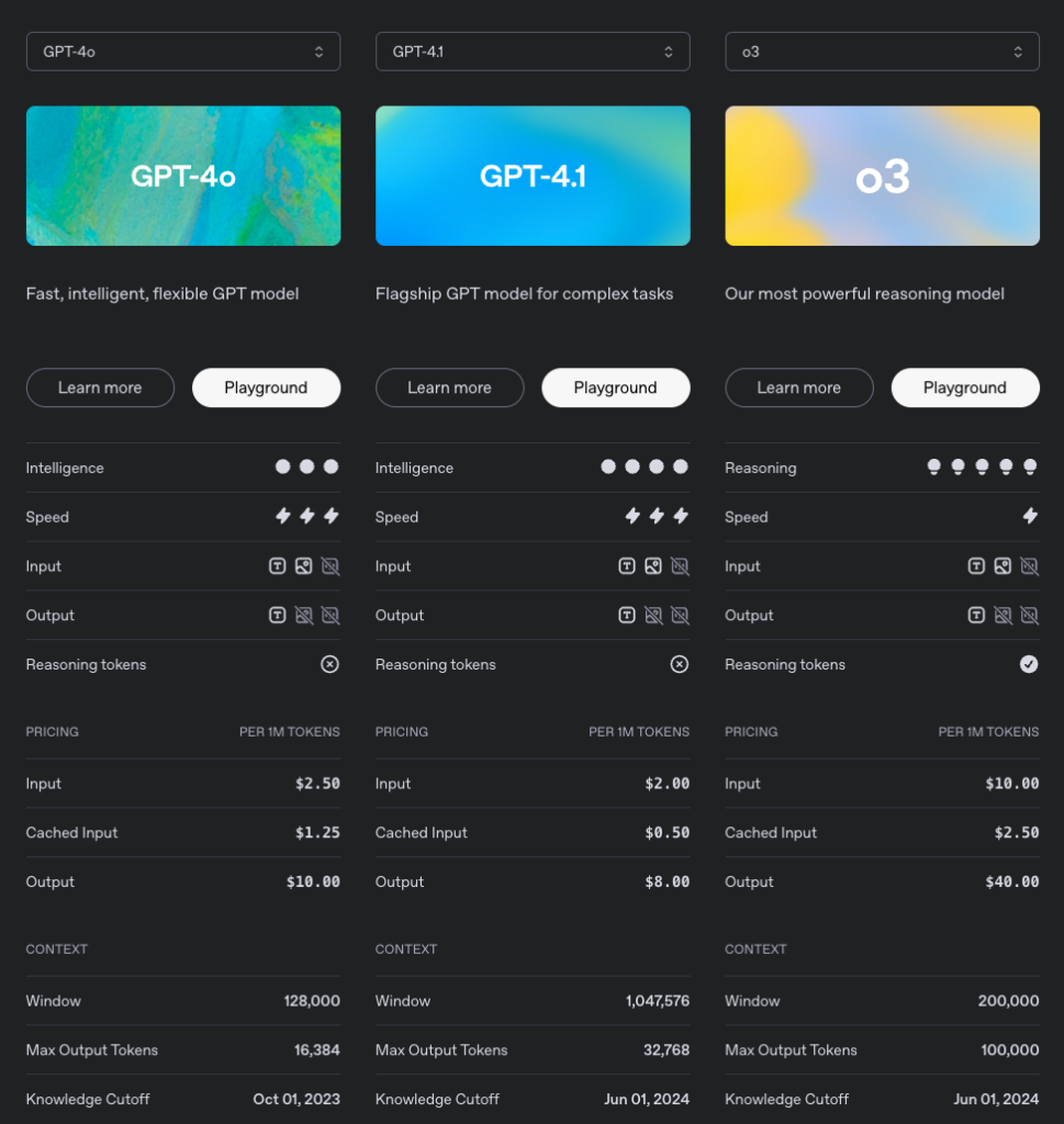 ChatGPT4oから4.1へは思考力や理解度といったスペックが一段あがり、推論モデルであるo3は処理速度は遅いものの精度が高いことがわかります。