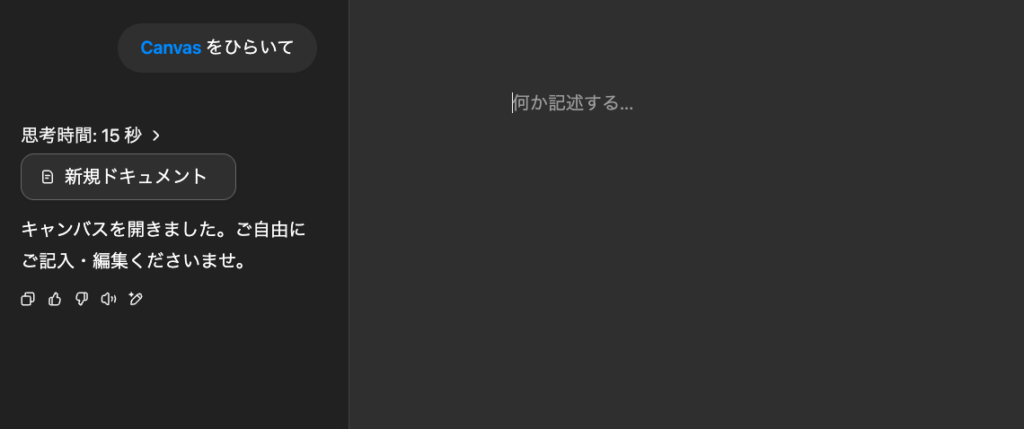 CanvasとはGoogleドキュメントやWordのように、文章の作成や修正をおこなえる機能です。AIが出力した文章を手動でそのまま修正できるため、都度指示をするといった手間がなくなります。