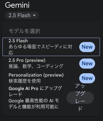 | 2.5 Flash | 2025年4月 | 2.0から大幅向上・軽量なコーディング・高速で浅い推論・マルチモーダル |