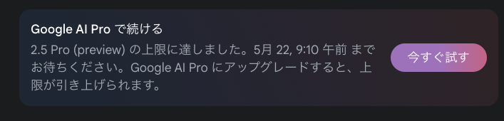 無料版の2.5Proで出力をした結果、数回の出力で制限を受けました。翌日には解除されるようですが、1日1回の利用や出力の遅さから使いづらさを感じますので、最新モデルをつかうなら有料版がいいでしょう。