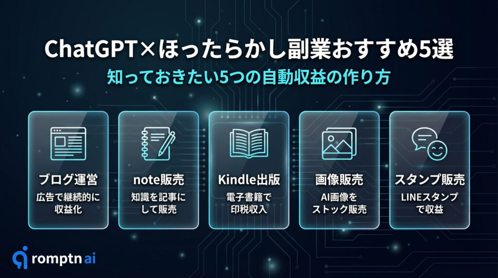 ここでは、ChatGPTを活用して「ほったらかし」で稼げる代表的な副業を5つ紹介します。それぞれの特徴や収益の目安、始め方を解説しますので、自分に合った方法を見つけてください。