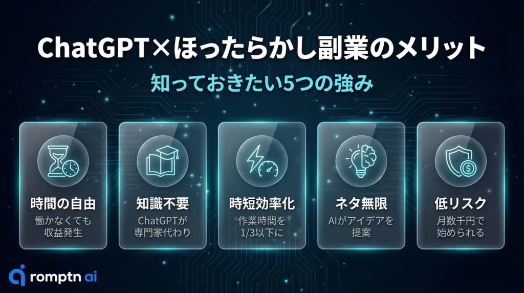 ここでは、実際の体験も踏まえてChatGPTを使ってほったらかし副業をするメリットをご紹介します。