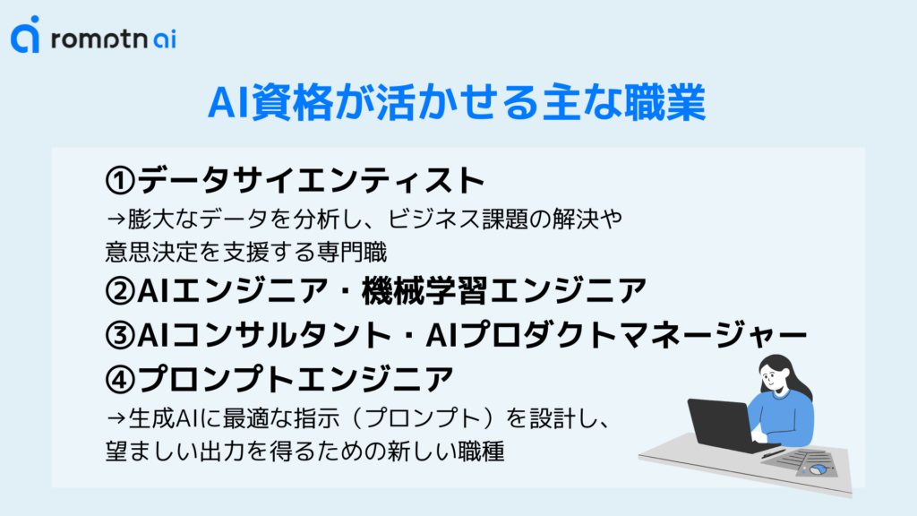 AI資格を取得した後、どんな職業で活躍できるのか気になりますよね。ここでは、AI資格が特に重宝される代表的な職種をご紹介します!