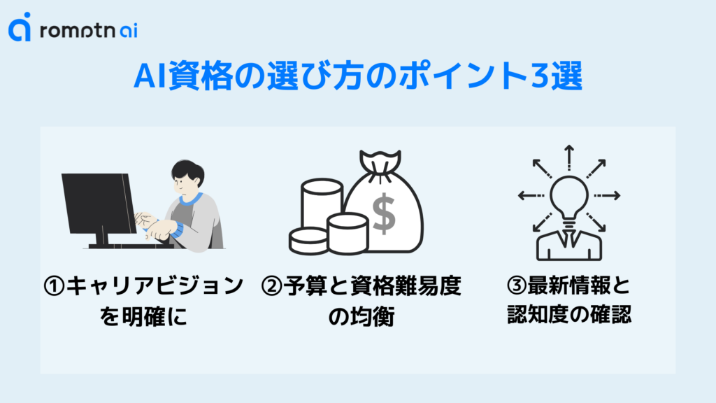数多くあるAI資格の中から、自分に最適なものを選ぶのは簡単ではありませんよね。ここでは、失敗しない資格選びのための3つの重要なポイントをご紹介します!