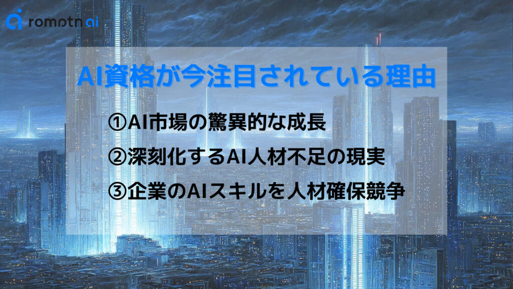生成AIの爆発的普及により、AI人材の価値が急激に高まっています。ここでは、なぜ今AI資格がこれほど注目を集めているのか、その背景を詳しく解説していきます!