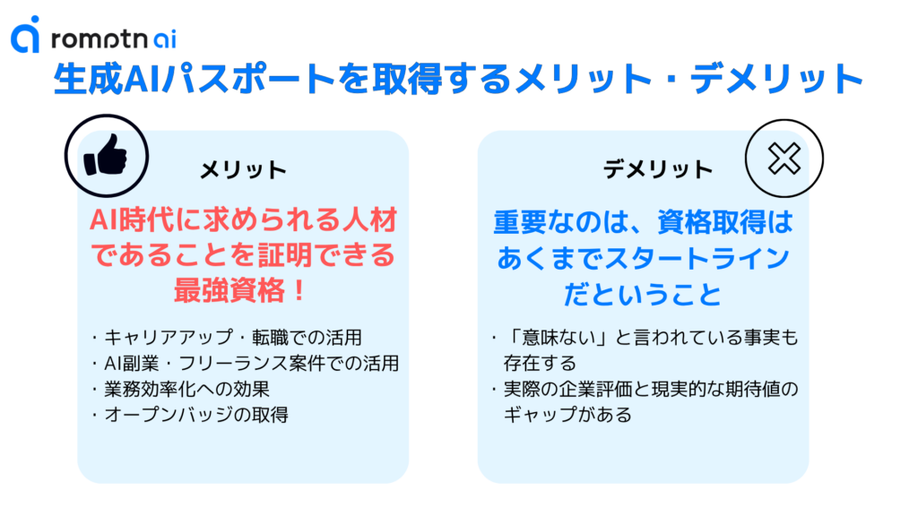 「生成AIパスポート=意味ない」という意見は半分正解で半分誤解。本質的には「AIを扱うための共通言語を持つこと」を証明する資格であり、就職や副業での信頼性・スタートラインの可視化という点で確実に意味があります。
