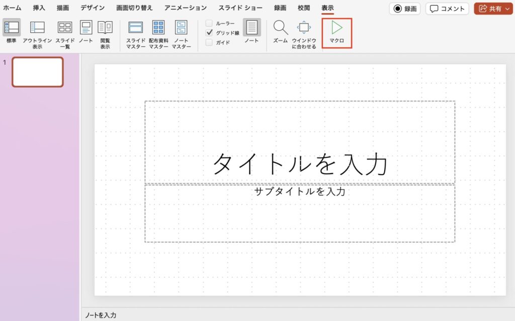 PowerPointを開き、「表示」→「マクロ」を選択します。