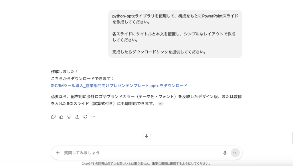 また、完成したらダウンロードリンクを提供してください。ChatGPTはこの指示を受けて、Pythonコードを実行し、数秒から数十秒で.pptxファイルを生成します。生成されたファイルは、チャット画面からダウンロードボタンをクリックするだけで、自分のパソコンに保存できます。