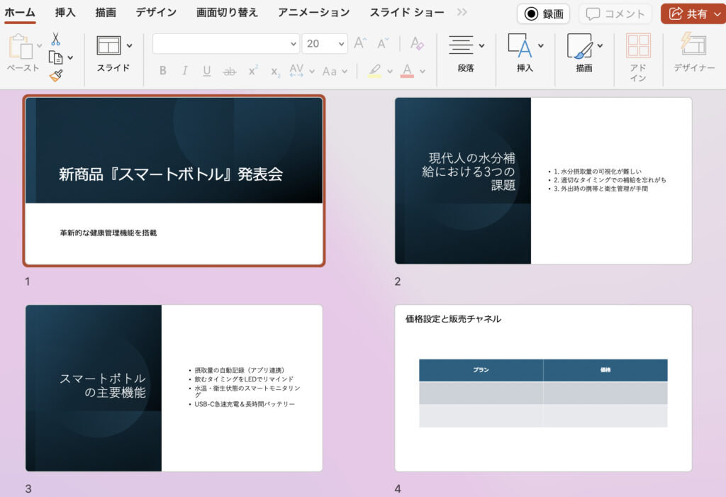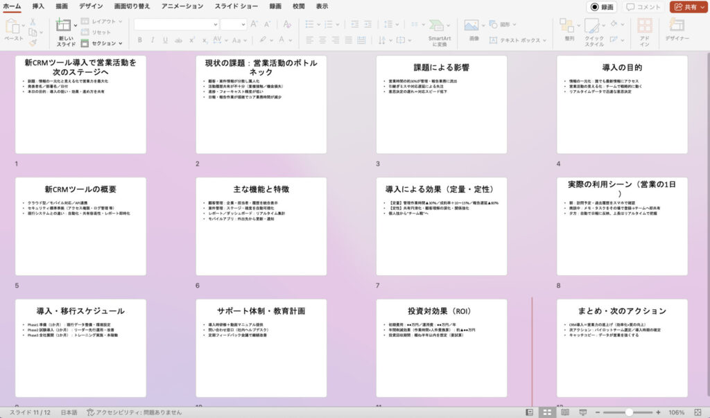 ただし、この方法で生成されるファイルは、デザイン的にはシンプルなものになります。フォントや配色、レイアウトの細かな調整は、生成後にPowerPointで開いて手作業で行う必要があります。とはいえ、すべてのスライドに文章が入力され、基本的な構造が完成した状態からスタートできるので、ゼロから作るよりも圧倒的に効率的です。