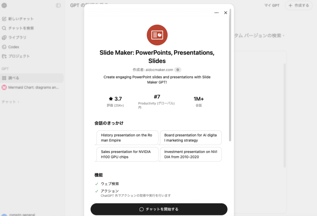 検索バーに「Slide Maker」や「PowerPoint」「プレゼンテーション」といったキーワードを入力すると、スライド作成に特化したGPTsが一覧表示されます。その中から「Slide Maker」を選択してクリックします。