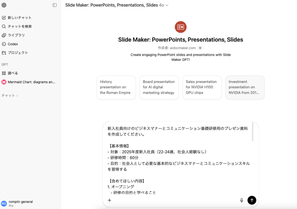 Slide Makerを開いたら、通常のChatGPTと同じようにチャットウィンドウが表示されます。ここにプレゼンの内容を入力します。