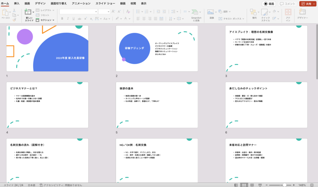 新入社員向けのビジネスマナーとコミュニケーション基礎研修用のプレゼン資料を作成してください。