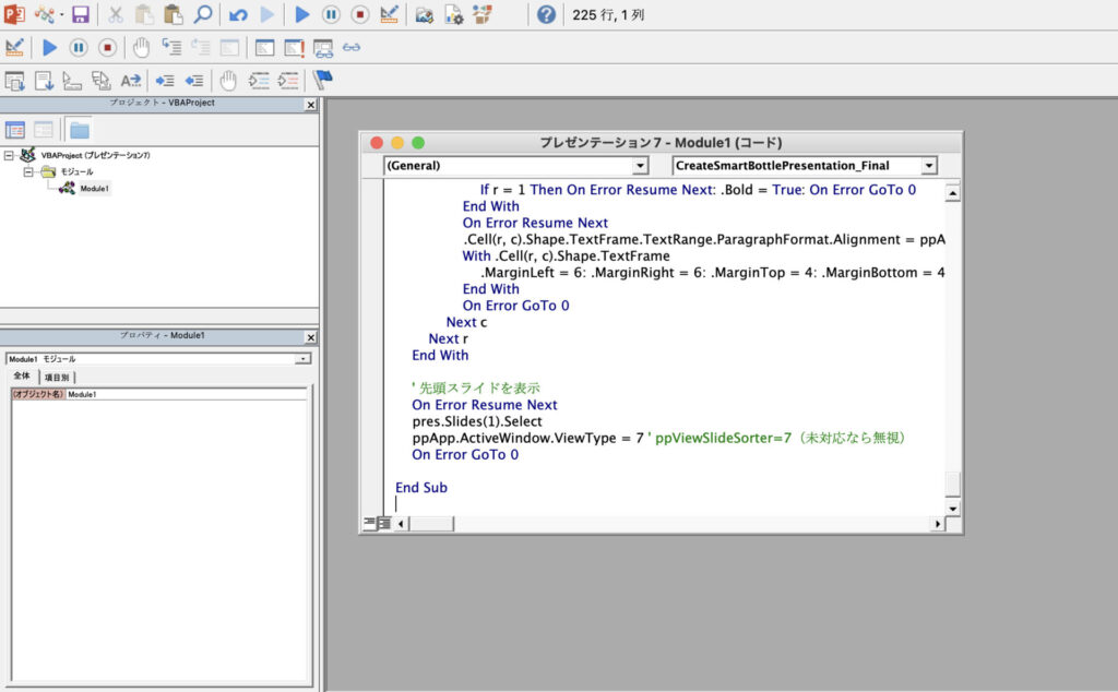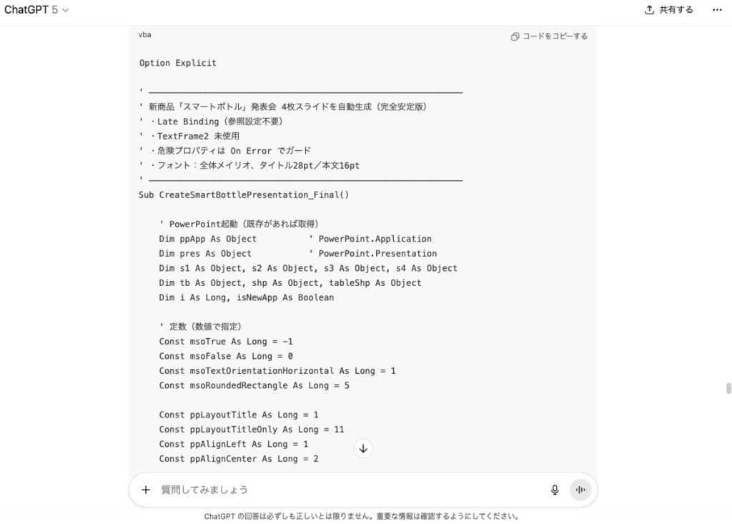 フォントは全体で「メイリオ」を使用し、タイトルは28pt、本文は16ptでお願いします。このように具体的に指示すると、ChatGPTは実行可能なVBAコードを生成してくれます。生成されたコードは、そのままコピーしてPowerPointで使用できます。