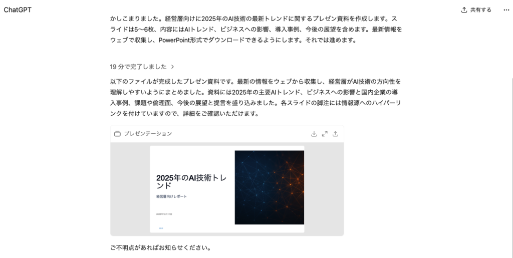 つまり、「新製品発表のプレゼンを作って」と一言指示するだけで、ChatGPTが市場調査から競合分析、資料構成、スライド作成まで、すべてを自動で完了してくれるのです。
