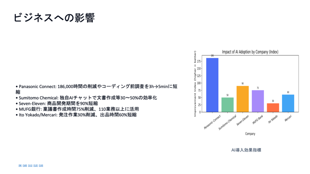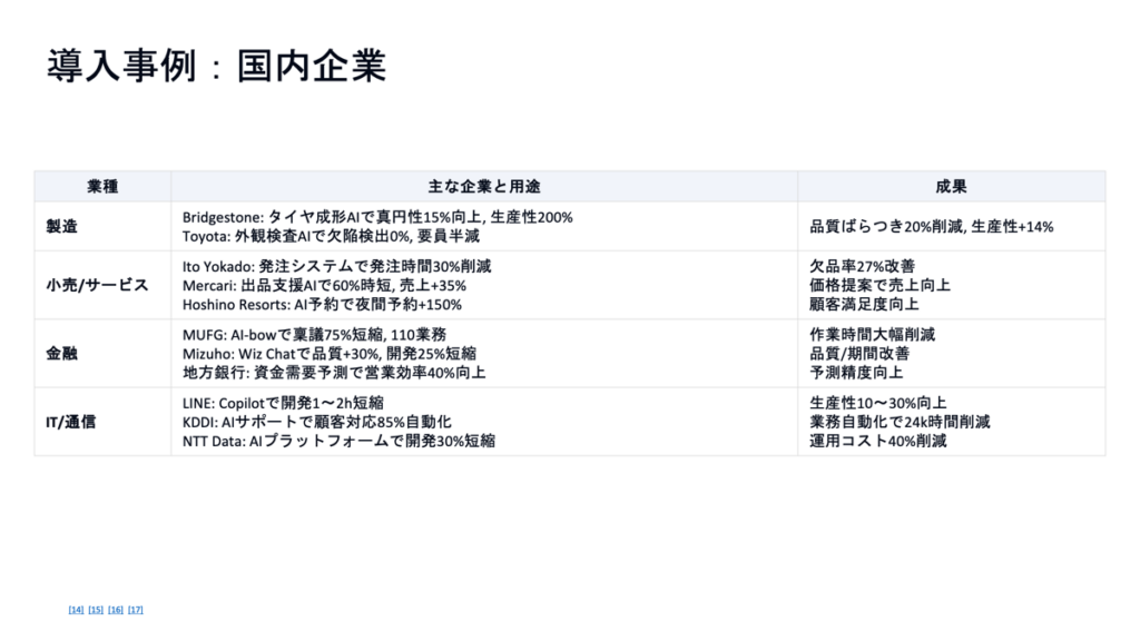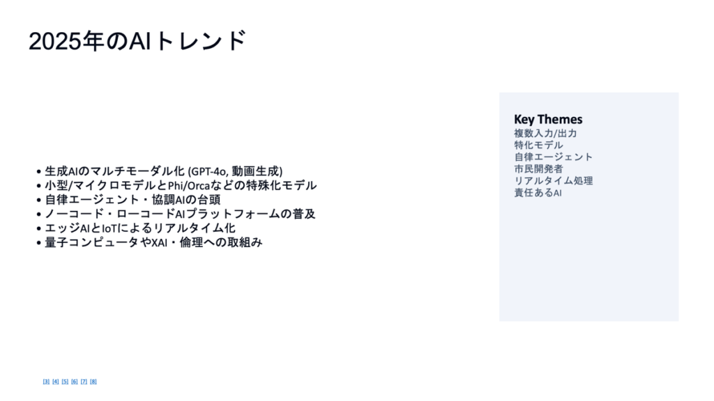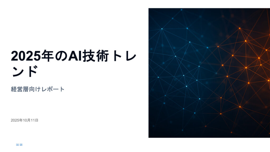 - 含める内容:2025年のAIトレンド、ビジネスへの影響、導入事例、今後の展望