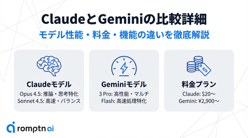 この記事ではClaudeとGeminiの機能や料金プランなどを徹底比較します。