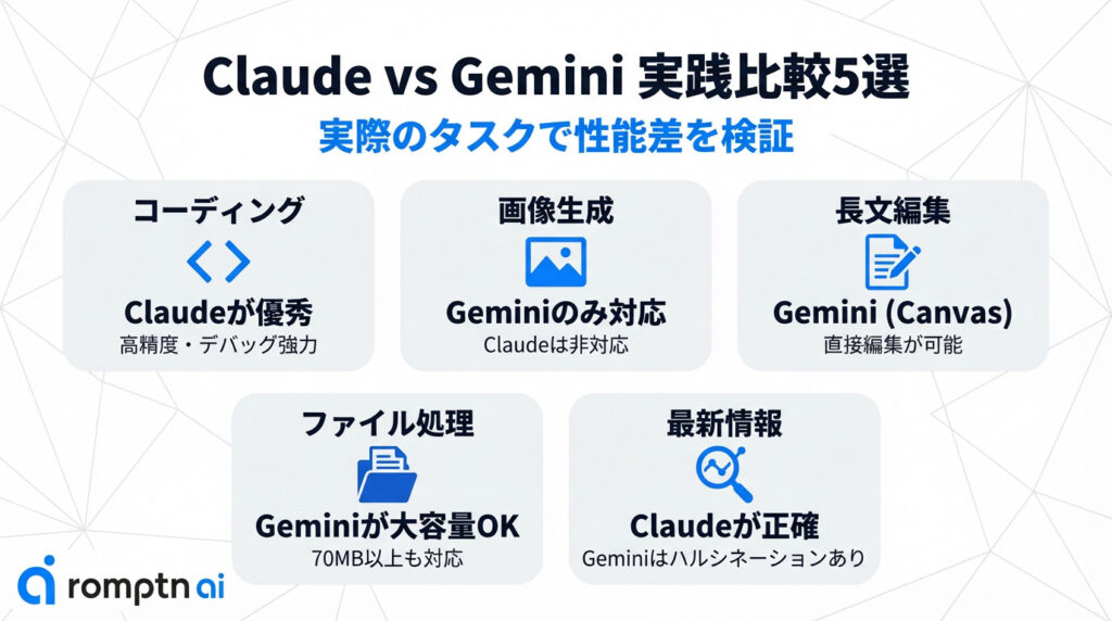 ClaudeとGeminiは、得意とする機能に違いがあります。ここでは、具体的なタスクを指示してそれぞれのAIがどのような結果を示すか検証します。