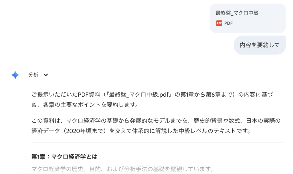 一方で、全く同じファイルをGeminiにアップロードしたところ、何も問題なく全体の要約を作成してくれました。
