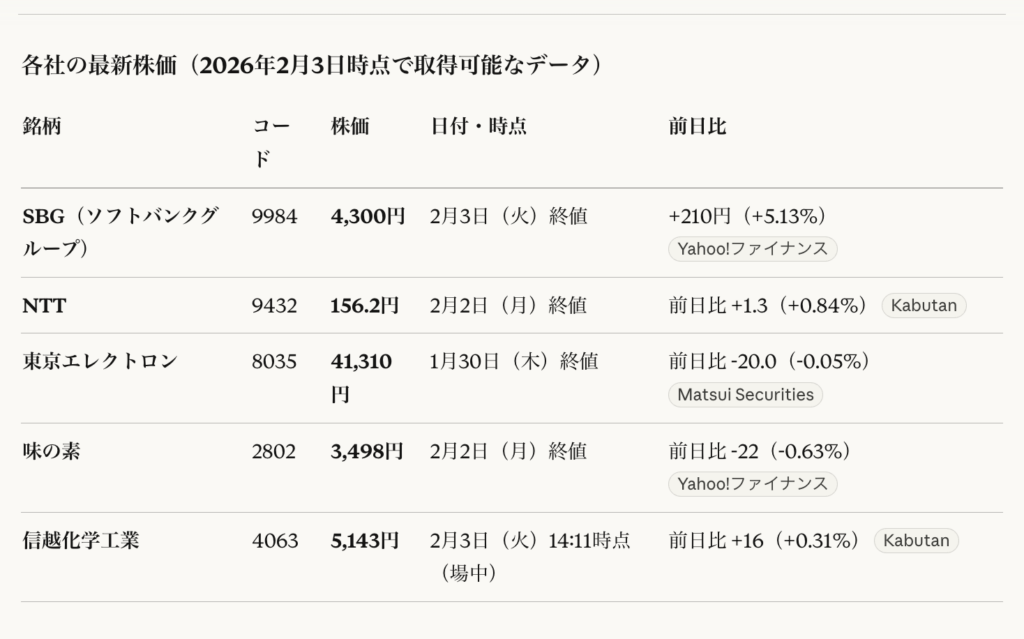 | 信越化 | 5,143円 | 5,137円 | 2/3(14:11):5,143円 2/3:5,133円 | Claudeは正しいが2/3の14:11の情報 Geminiは誤り |