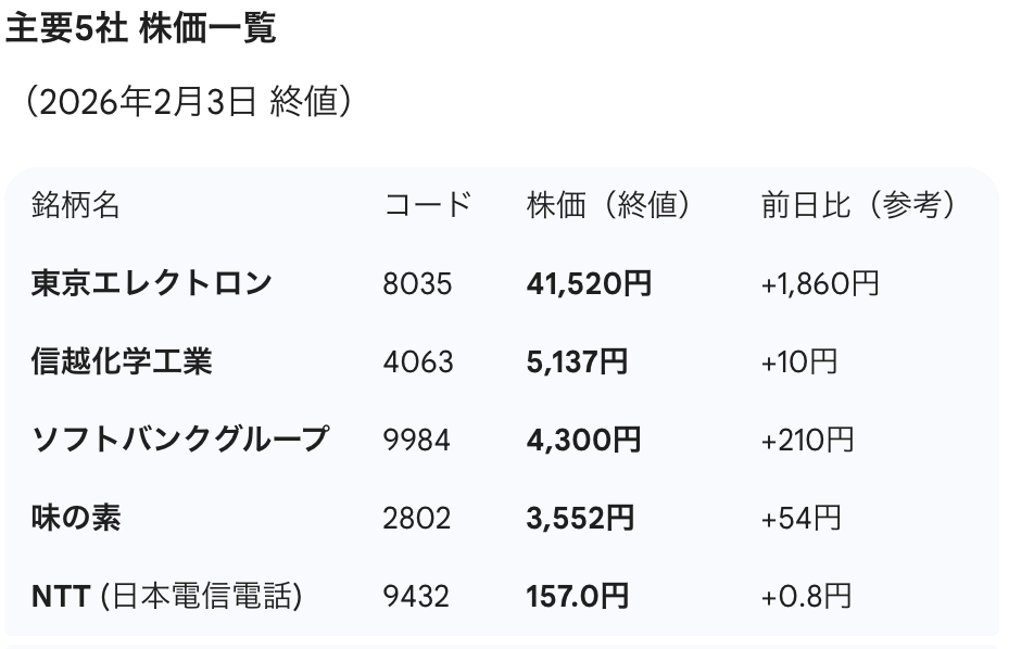 | 東エレ | 41,310円 | 41,520円 | 1/30:41,310円 2/3:41,560円 | Claudeは正しいが1/30の情報 Geminiは誤り |