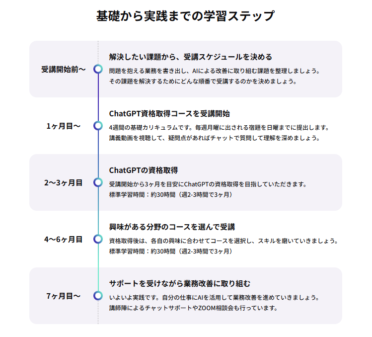 1〜3ヶ月目でChatGPTの基礎と資格取得、4〜6ヶ月目で興味のあるコースを選択学習、7ヶ月目以降で実際の業務でのAI活用実践という段階的なカリキュラムになっています。